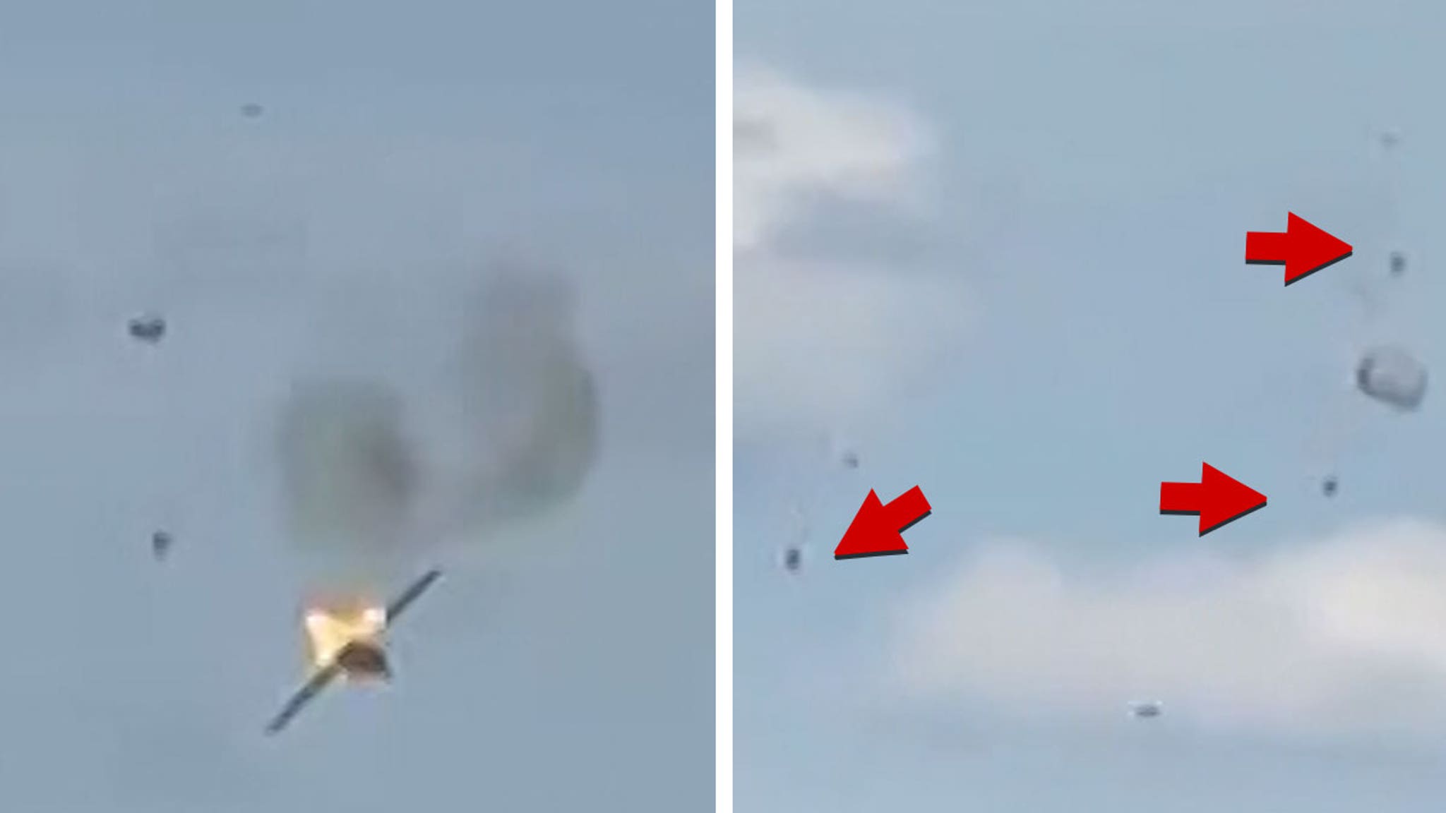 Smoke was seen emitting from the plane, and even some debris appeared to be falling off as it descended. Soon, it was nosediving … and it eventually crashed, creating a loud boom and an explosion. Fortunately, the two dudes who were flying the thing ejected themselves.