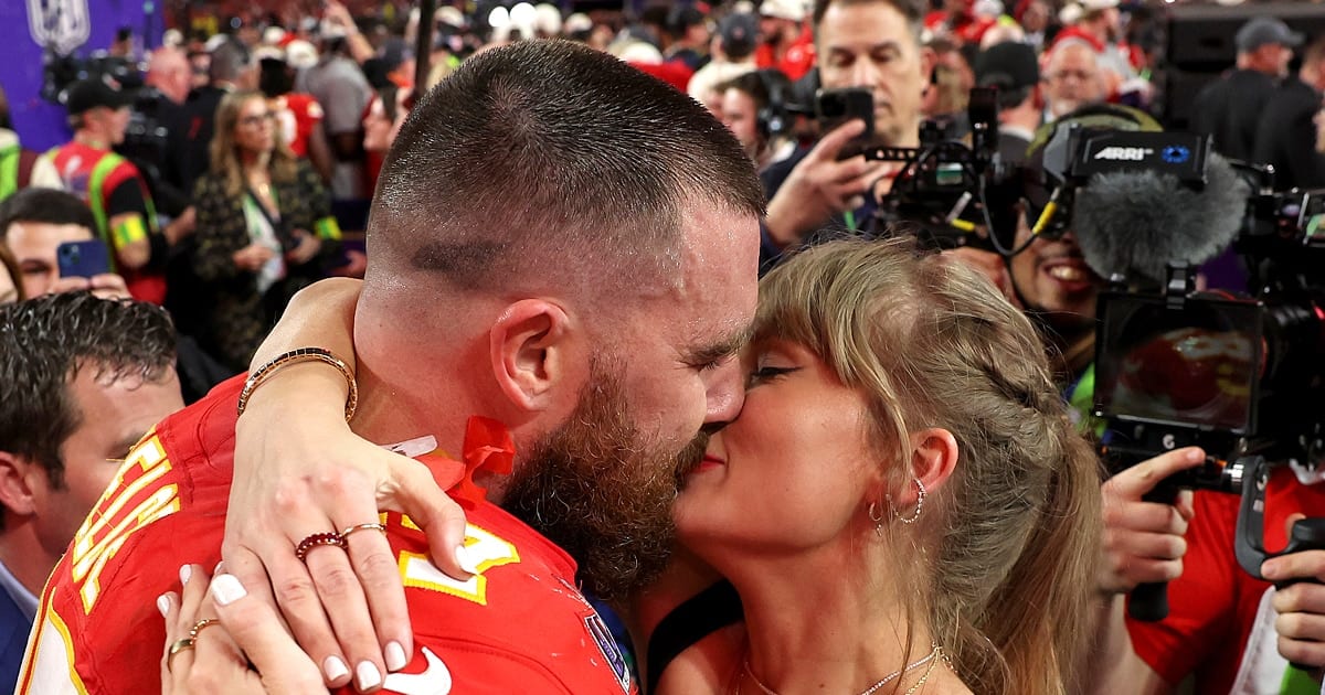 The pair locked lips on the field after Travis led the Kansas City Chiefs to victory on Feb. 11, 2024 in Las Vegas.