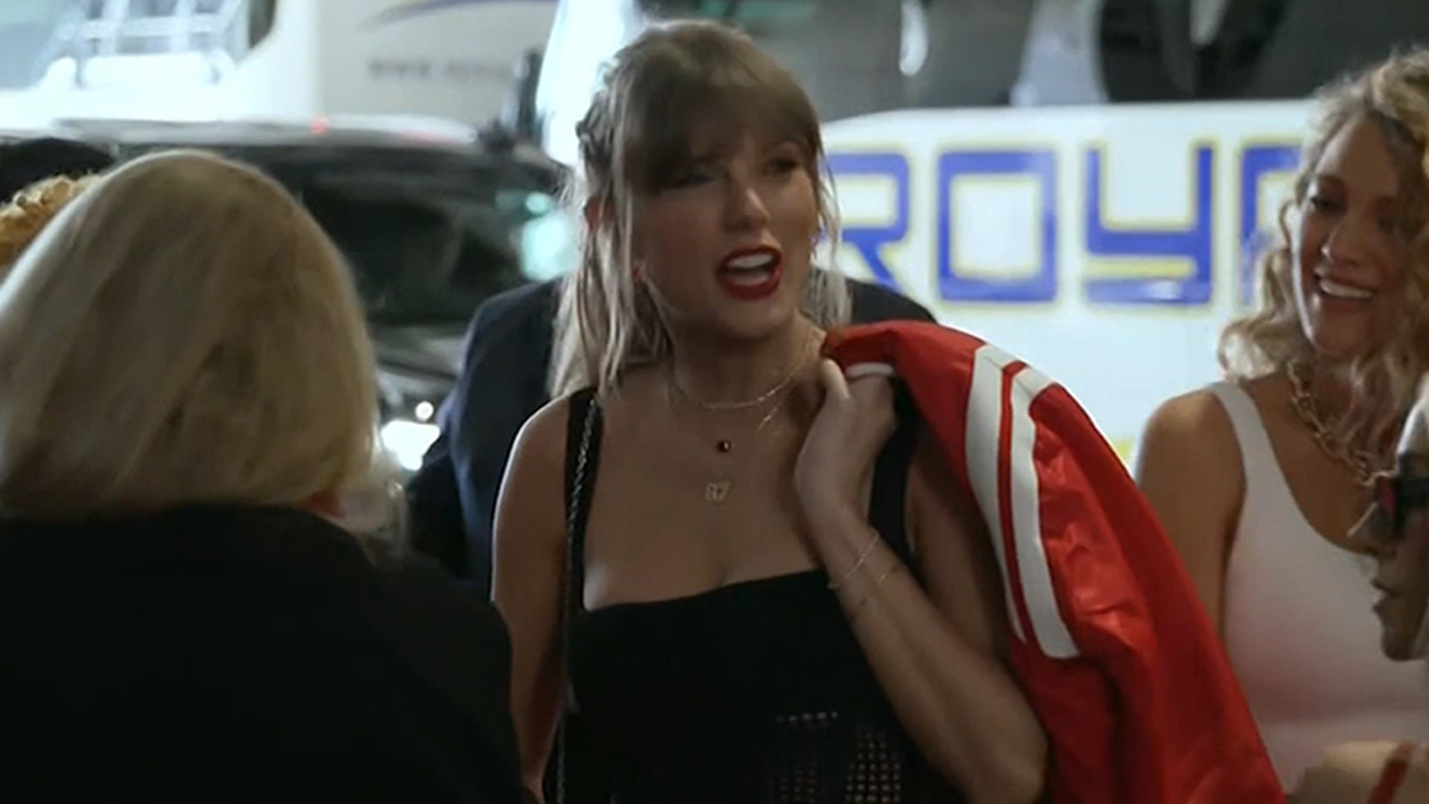 1:30 PM PT — Taylor Swift is in the building!!! CBS’ broadcast just showed the pop star pulling up to Allegiant Stadium along with several close/famous friends including Ice Spice who appears to be hugging Swift’s mom Andrea and Blake Lively who’se decked in a bright red jacket.